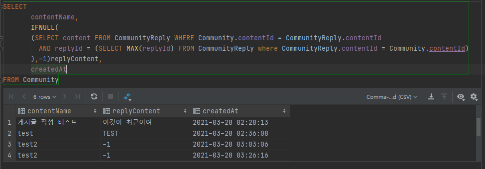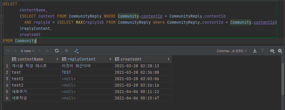 AND replyId = (SELECT MAX(replyId) FROM CommunityReply where CommunityReply.contentId = Community.contentId)