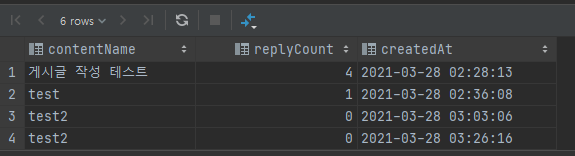 게시판의 글 제목과 글의 달린 댓글 수, 생성 시간을 한 번에 출력할 수 있습니다.