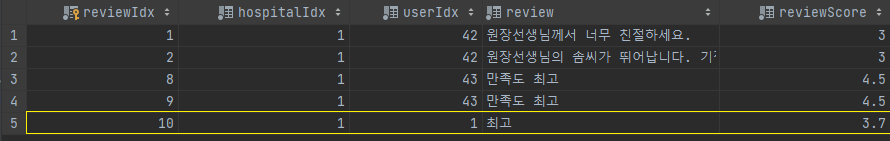 ์ด๋ ๋ฐ์ดํฐ๋ฒ ์ด์ค์ 10์ด๋ผ๋ PK๊ฐ์ ๊ฐ์ง๋ฉฐ reviewIdx์ปฌ๋ผ์ ์ ์ฅ๋์๋ค์.