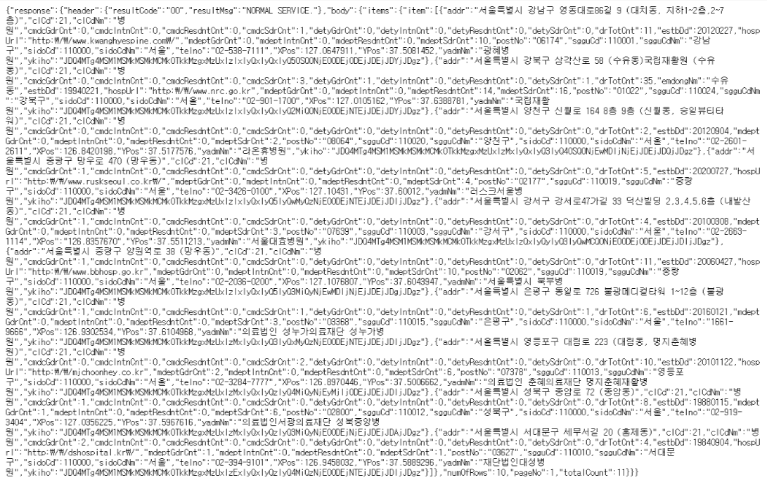 '๋ณ์์ ํ๋ฒํธ : ' + info['response']['body']['items']['item'][i]['telno']
