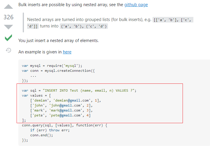 How would one do a bulk insert into mySQL if using something like https://github.com/felixge/node-mysql
