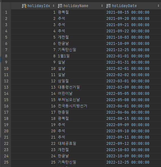 ๊ณตํด์ผ ๋ ์ง๋ฅผ ์ ๋ถ DB์ ์ ์ฅํ๊ณ ์ ํ์์ต๋๋ค.