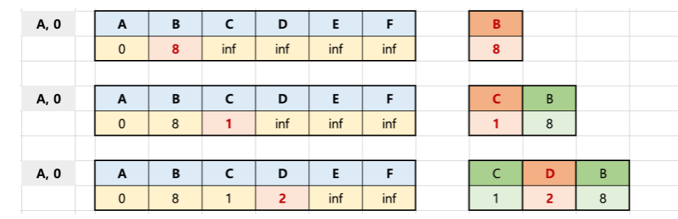 6. ์ฐ์ ์์ ํ์์ (F, 7), (B, 8)๋ฅผ ์์ฐจ์ ์ผ๋ก ์ถ์ถํด ๊ฐ ๋ ธ๋ ๊ธฐ๋ฐ์ผ๋ก ์ธ์ ํ ๋ ธ๋์์ ๊ฑฐ๋ฆฌ ๊ณ์ฐ