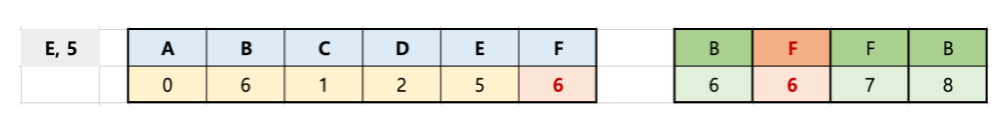 - A - E ๊ฑฐ๋ฆฌ๊ฐ 5์ธ ์ํ์์, E์ ์ธ์ ํ F๋ฅผ ๊ฐ๋ ๊ฑฐ๋ฆฌ๋ 1, ์ฆ A - E - F๋ 5 + 1 = 6, ํ์ฌ ๋ฐฐ์ด์ A - F ์ต๋จ๊ฑฐ๋ฆฌ๊ฐ 7๋ก ๊ธฐ๋ก๋์ด ์์ผ๋ฏ๋ก, F, 6์ผ๋ก ์