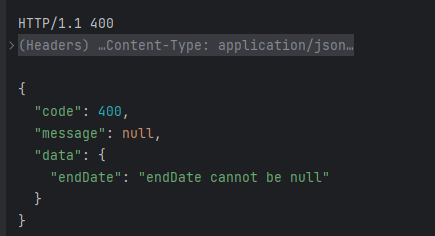 실제로 null일 수 없는 값을 null로 하여 요청하면 커스텀 핸들러가 에러를 처리해서 response를 보내게 됩니다.