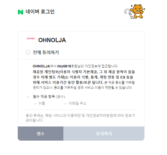 최초 로그인시 정보 제공을 동의하는지 나옵니다.