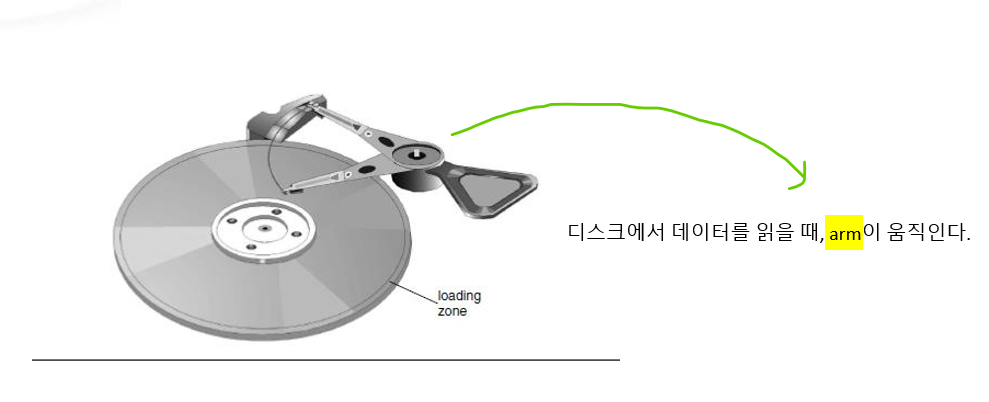디스크에서 데이터를 읽을 때, 액츄에이터 암이 움직이면서 데이터를 읽게 됩니다.