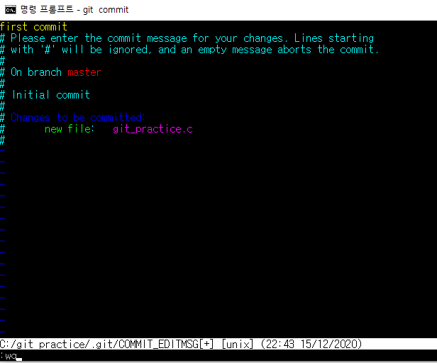 커밋 메시지를 입력한 후, esc를 누르고 :wq를 누르면 메시지를 저장하면서 성공적으로 커밋이 끝나게 됩니다.