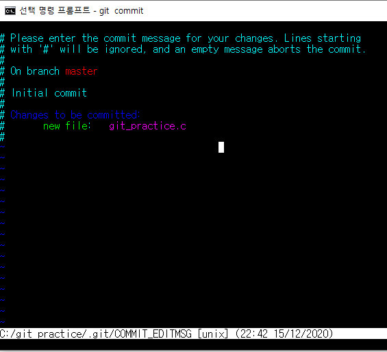 git commit 명령어를 실행해 봅시다 아래와 같은 창이 뜨게 됩니다.