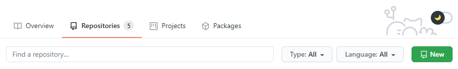 그리고 내 프로필 창에서 Repositories를 누른 후 초록색 New버튼을 눌러줍시다.