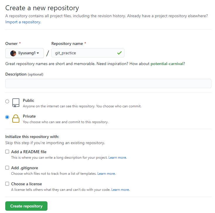 공개 저장소로 만들 것인지, 개인 저장소로 만들 것인지 선택할 수 있습니다.