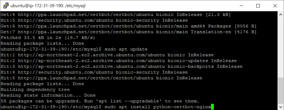 아래의 명령어를 통해 업데이트를 진행 한 뒤 Certbot 소프트웨어를 설치해 줍시다.