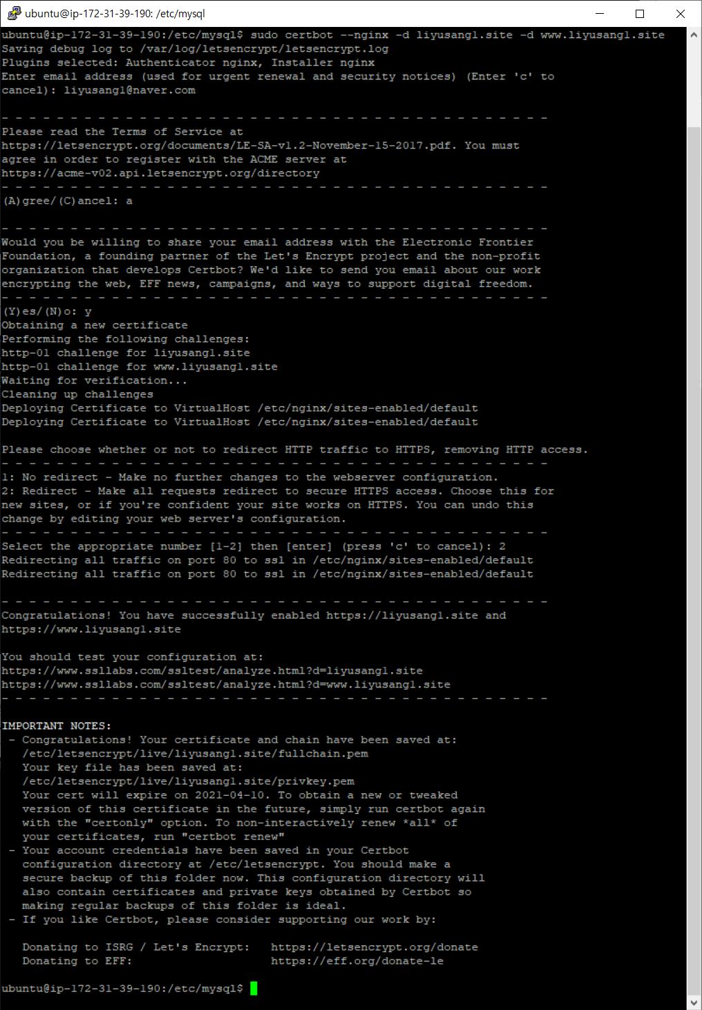 1. Let's Encrypt를 사용하여 보안 연결 HTTPS 연결이 되도록 하기 위해 SSL 인증서를 얻기.