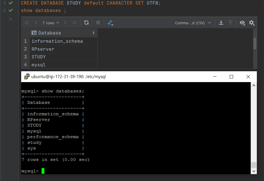 STUDY라는 데이터베이스를 만들고 show databases라는 쿼리를 날려봅시다.