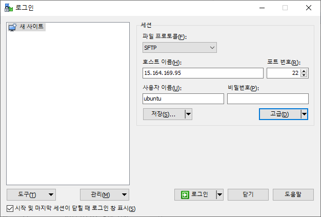 Winscp를 실행하여 AWS에서 생성한 인스턴스의 IPv4 주소를 복사하고 호스트 이름에 입력해 줍시다.