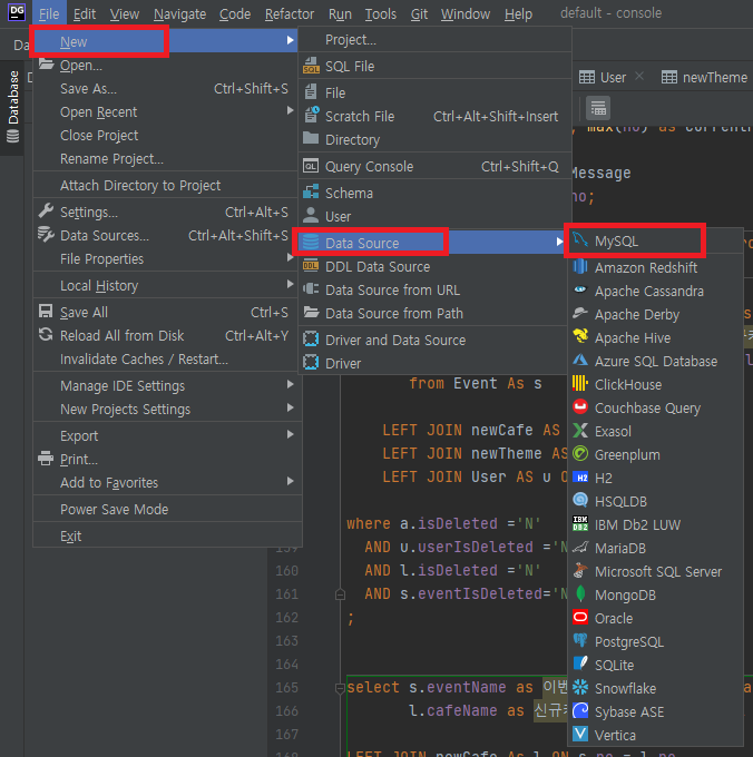 DataGrip에서 아래와 같이 새로운 Data Source를 생성해 줍시다.