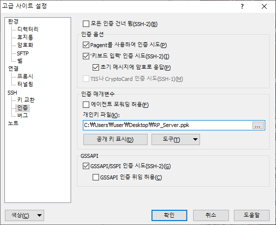 또한 고급 - 인증 - 개인키 파일에서 아까 다운로드한 새 키 페어를 지정해 줍시다.!!