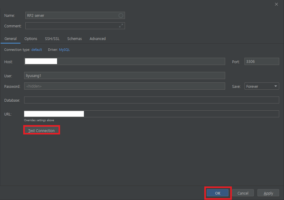 인스턴스의 ip주소를 입력하고, 생성한 MySQL 사용자와 암호를 입력해 주고 Test Connection을 진행합시다.