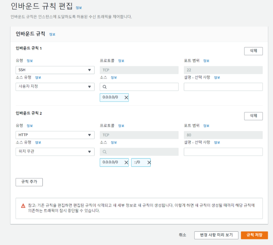인바운드 규칙 편집을 통해 HTTP 유형을 추가해 줍니다.