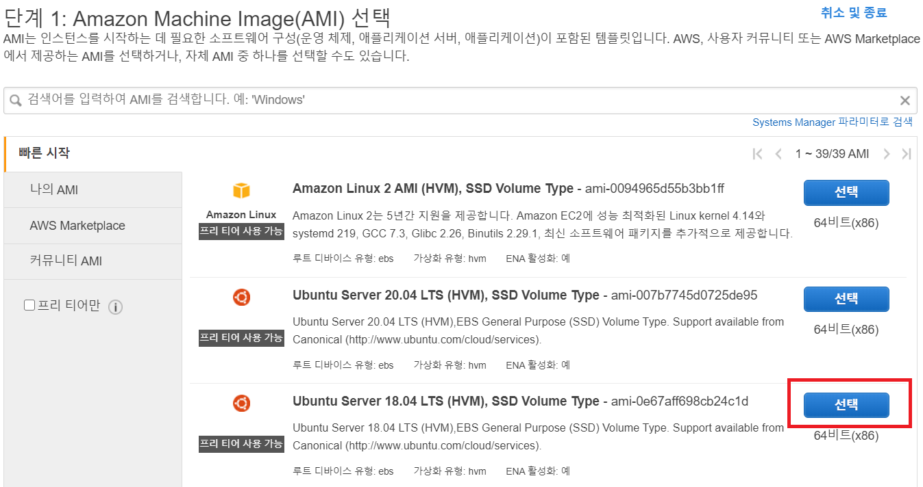 많은 AMI가 있지만 프리 티어 사용 가능한 Ubuntu Server 18.04 LTS를 선택했습니다.