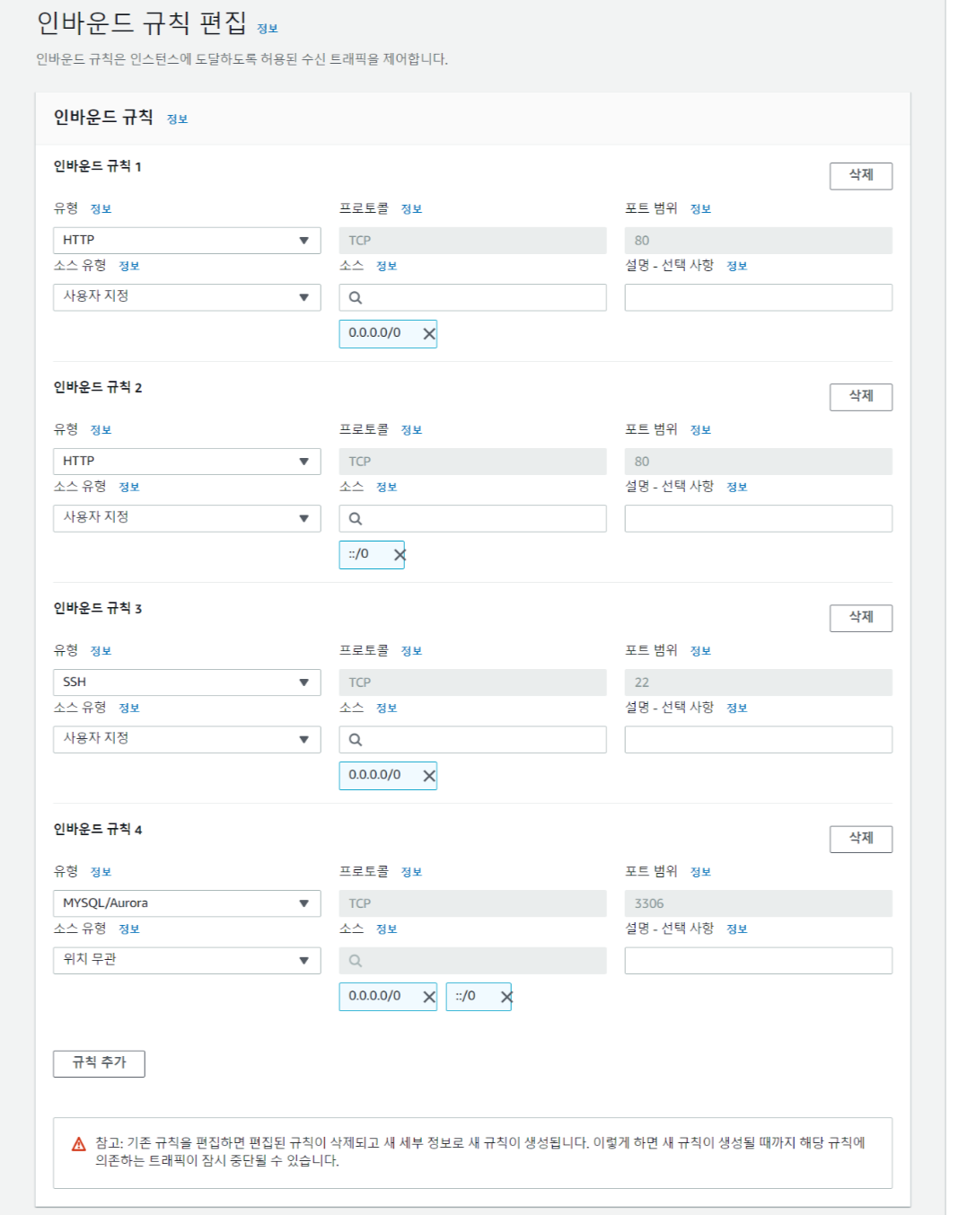 AWS의 인바운드 규칙 편집을 통해 MYSQL 포트를 열어 줍니다.