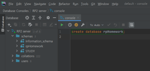 명령어를 실행하고 schemas에 보면 rphomework라는 데이터베이스가 생성된 것을 볼 수 있습니다.