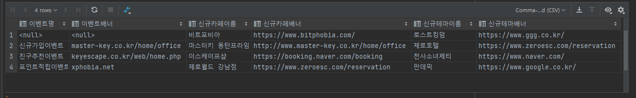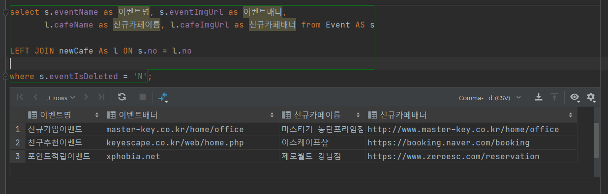 Join 문을 활용하여 Evnet테이블과 newCafe테이블의 정보를 한 번에 제공하도록 할 수 있습니다.
