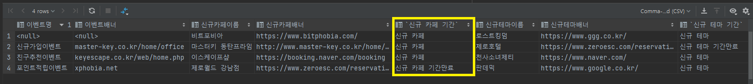 칼럼 이름은 '신규 카페 기간'이라고 표시.