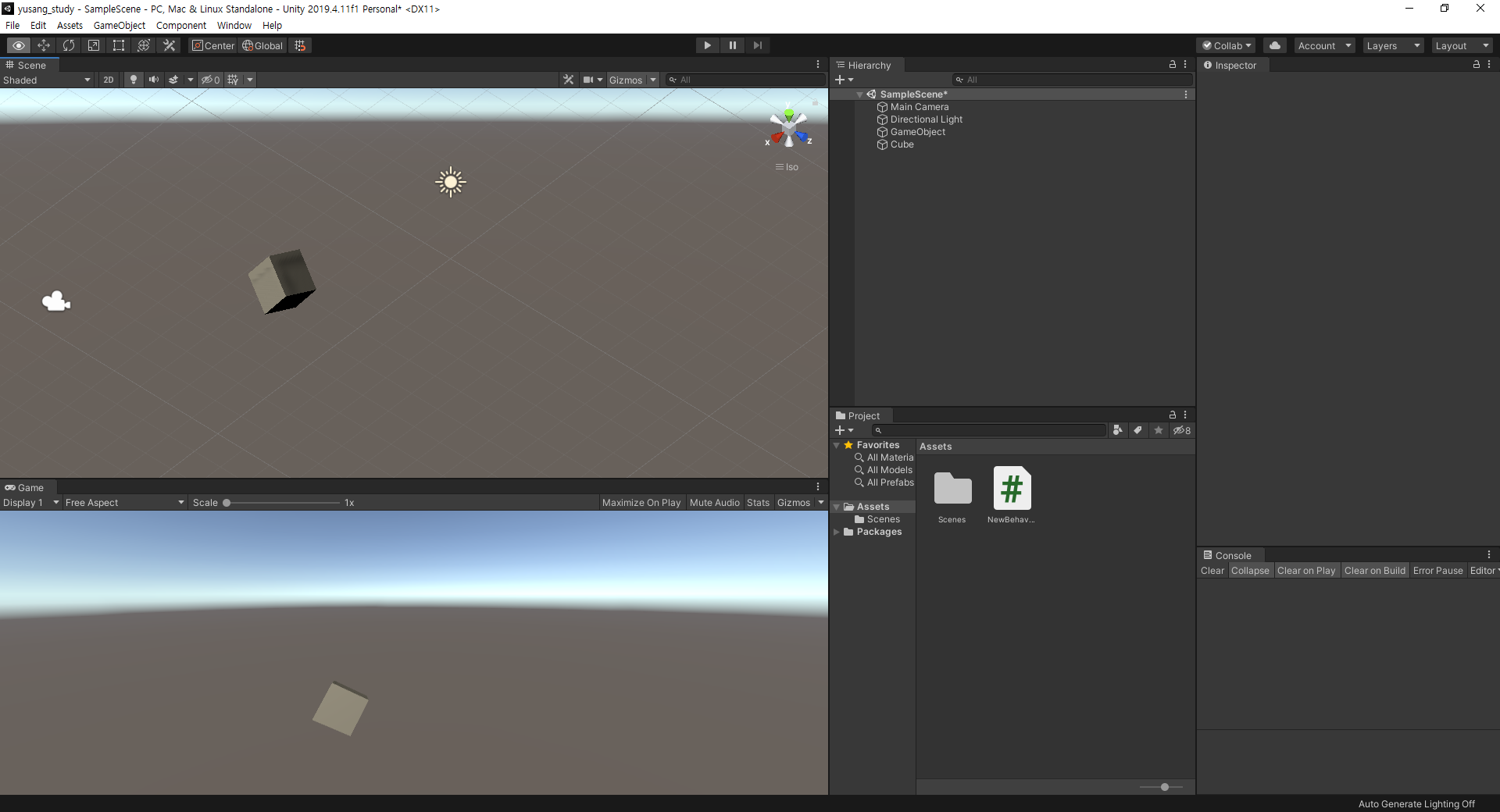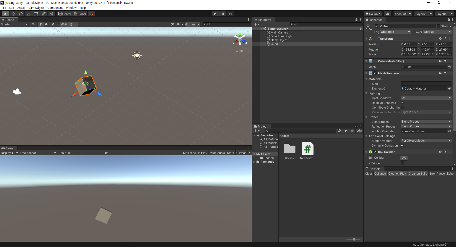 유니티에서 큐브를 하나 생성하고 큐브를 선택하여서