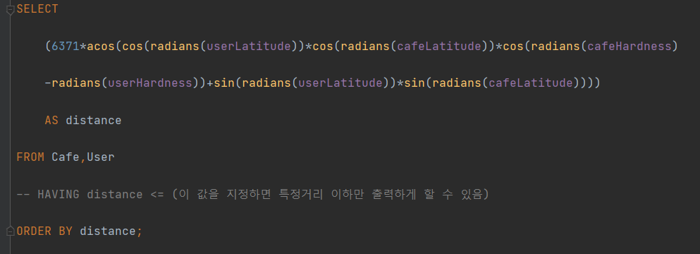 -- HAVING distance <= (이 값을 지정하면 특정거리 이하만 출력하게 할 수 있음)