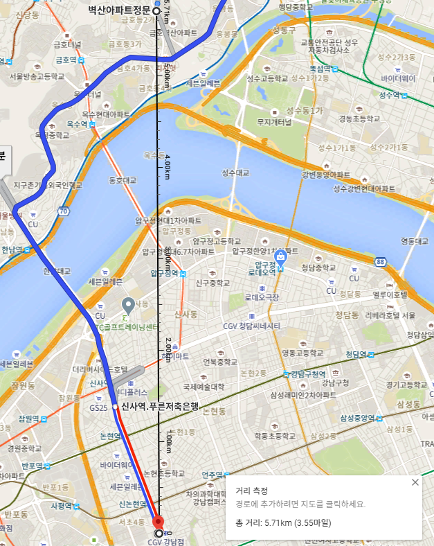 구글 지도에서 실제로 거리를 측정하면 정말 신기하게도 같은 값이 나옵니다.