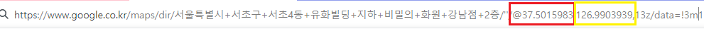 구글 지도에 구하고자 하는 위치를 검색하고, 주소를 보면 이런 식으로 위도 경도가 나와있습니다.