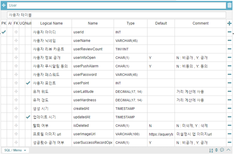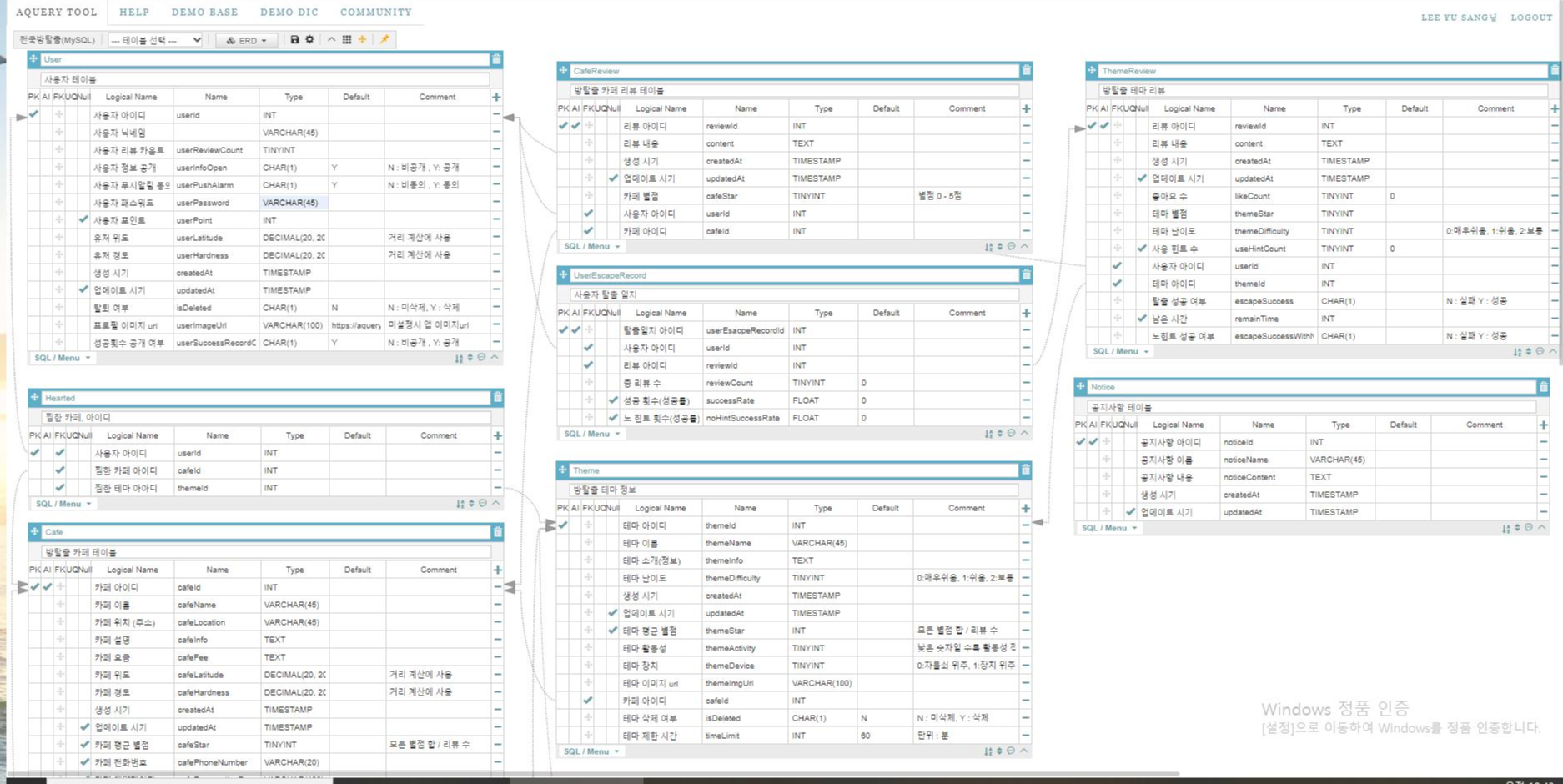 aquerytool를 이용해 아래와 같이 ERD 설계를 했습니다.