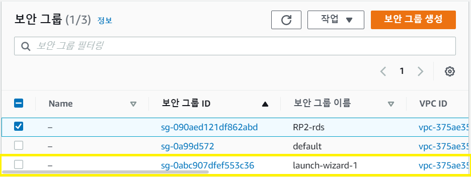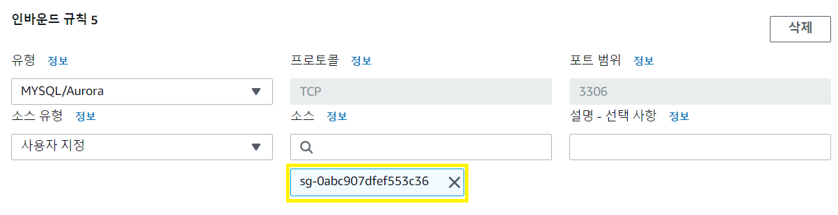 RDS의 인바운드 규칙에 EC2의 보안 그룹 ID를 복사해서 추가해 줍시다.