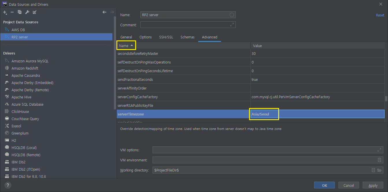 Advanced - Name를 클릭 후 정렬 후 - serverTimeZone을 Asia/Seoul로 설정