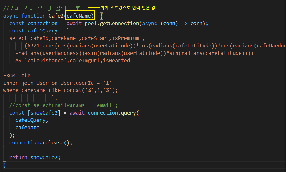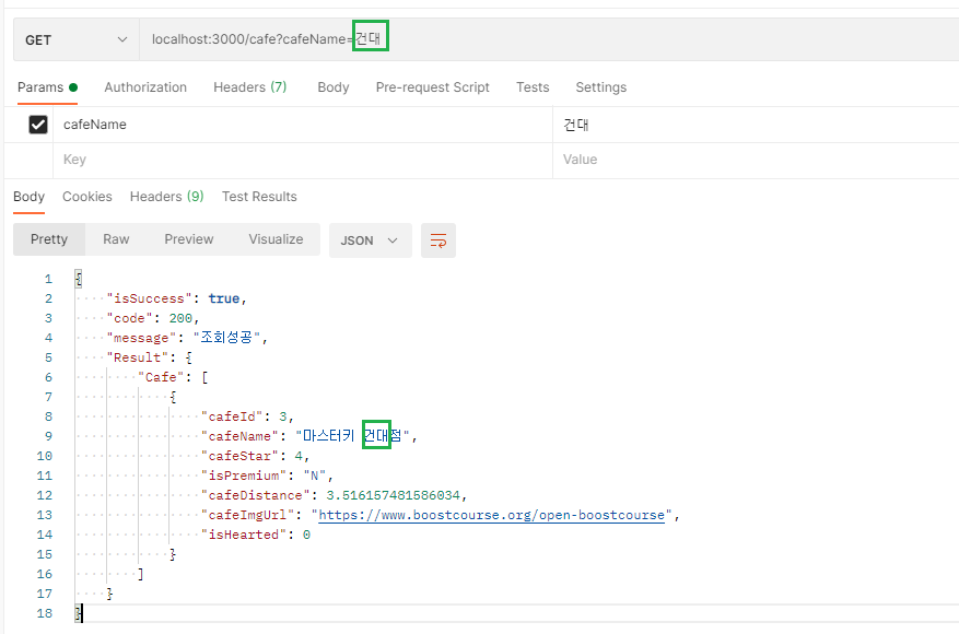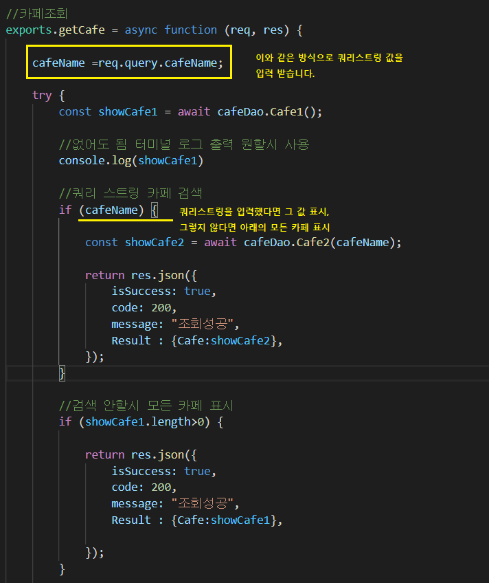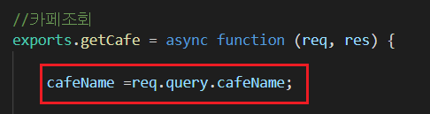 와 같이 요청을 하게 되면 cafeName에 값이 들어가게 되어 그 카페만을 출력하게 됩니다.
