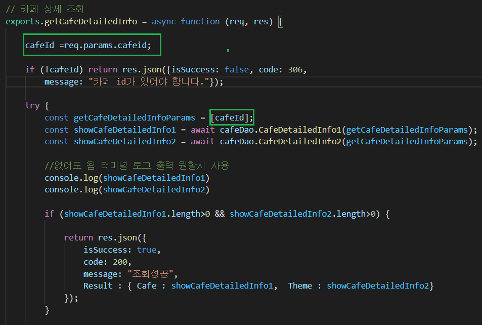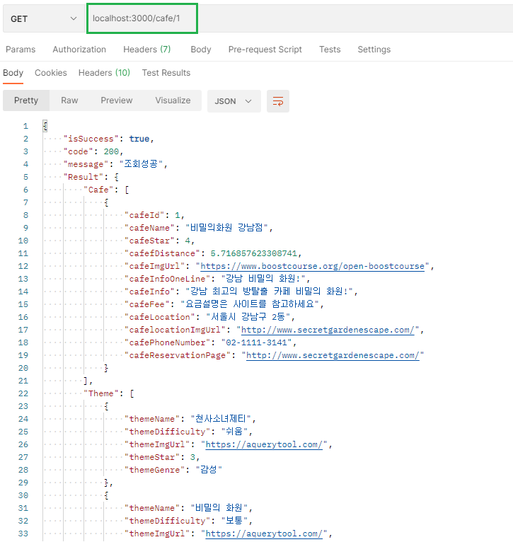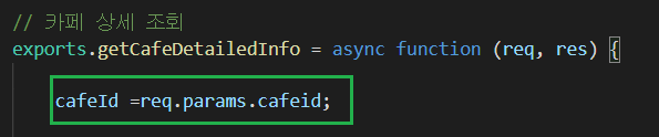 /cafe/:cafeId 와 같이 요청을 하면 됩니다. (cafeId자리에 원하는 값 입력)