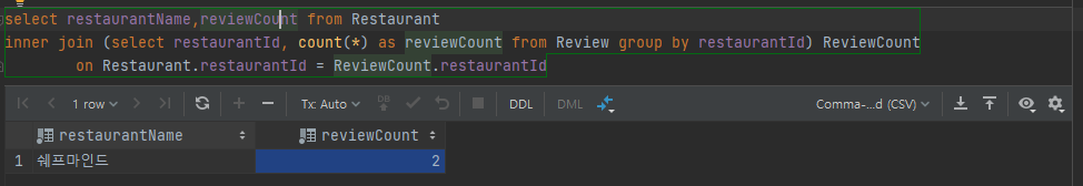 아래와 같은 쿼리를 실행하면 각 식당의 리뷰수가 몇 개 인지 출력할 수 있습니다.