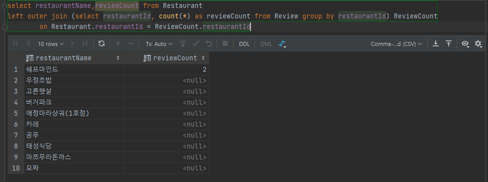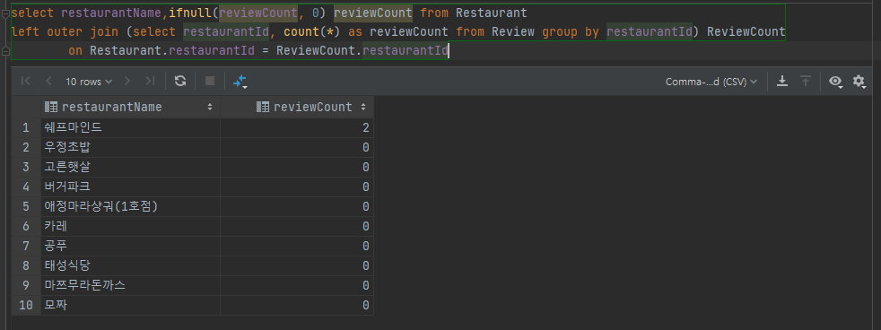 리뷰수 가 0개인 식당도 같이 출력하게 하려면 null 값도 표시 하는 left outer join을 활용하면 됩니다.