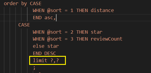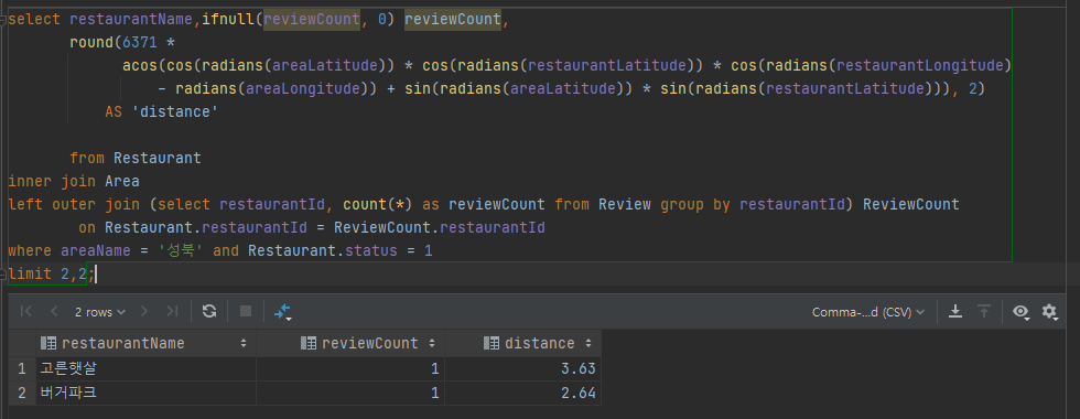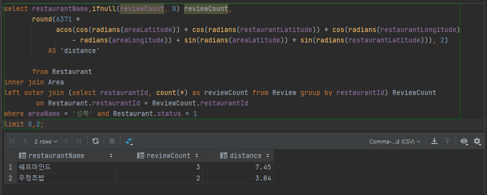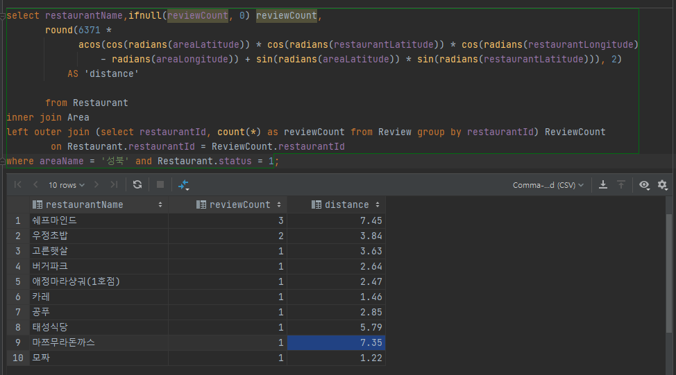 아래와 같은 쿼리를 작성하게 되면 식당 이름과 reviewCount, distance를 보여주게 됩니다.