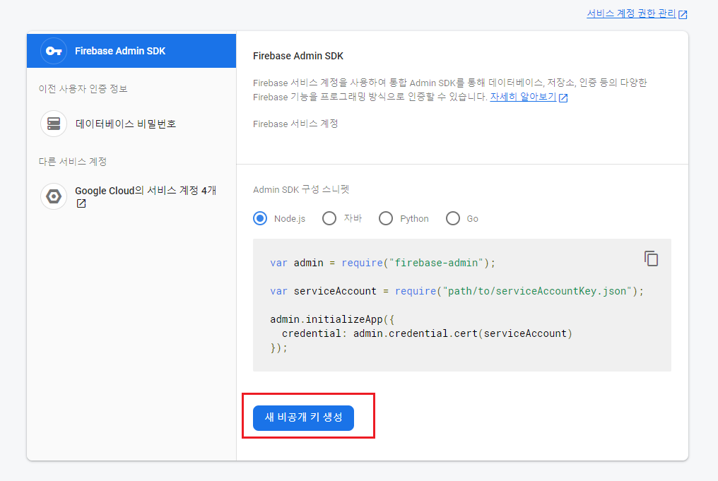 아래와 같이 프로젝트 설정 - 서비스 계정 - 새 비공개 키 생성을 통해 비 공개키를 다운로드 해 줍시다.