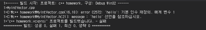 원인은 바로 함수의 디폴트 값을 함수의 선언과 함수의 정의 부분에 전부 작성해서 그렇습니다.