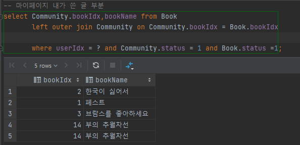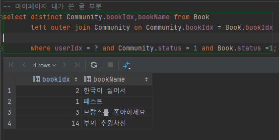 아래와 같이 Community라는 테이블에 내가 작성한 글들의 책이름과 책 인덱스를 출력하도록 쿼리를 짰습니다.