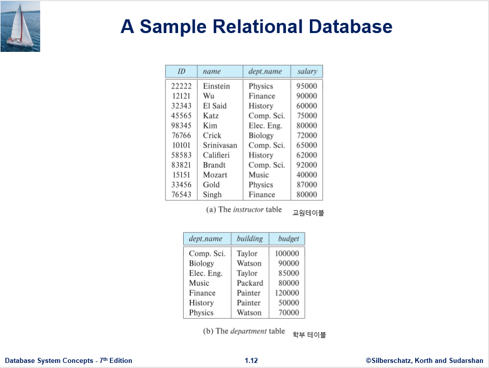 위 사진은 관계형 데이터베이스 모델의 예시입니다.